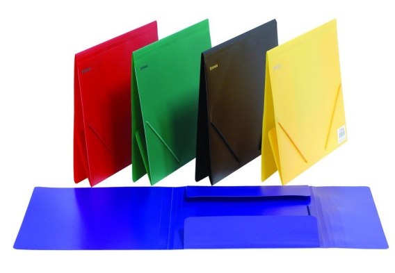Gładka, wykonana z ekologicznego PP o grubości: 0,5mm_2 narożne, okrągłe gumki zamykające w kolorze teczki_3 wewnętrzne skrzydła