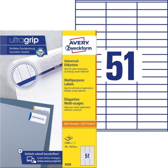 Technologia druku:•INK JET: Tak•LASER: Tak•LASER COLOR: Tak•KSERO: TakCechy produktu:•Rozmiar etykiety (mm): 70 x 16,9•Etykiet / arkusz: 51•Arkuszy/ opakowanie: 100•Etykiet/ opakowanie: 5100•Kolor: białe•Format: A4•Rzędów/ arkusz: 3x17•Certyfikaty: FSC
