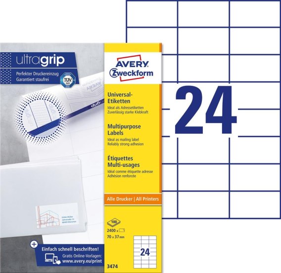 Trwałe Etykiety AVERY ZWECKFORM uniwersalne A4, 100 ark./op., 70 x 37 mm, białe |